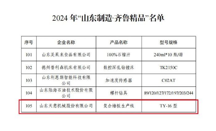 近日,山東省工信廳公布了2024年“山東制造·齊魯精品”名單,天意機械裝配式建筑智能裝備榜上有名!