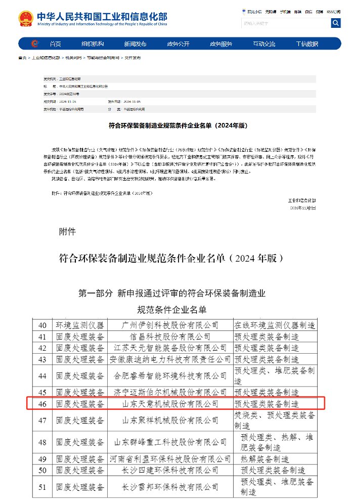 近日,工信部公布了2024年環(huán)保裝備制造業(yè)規(guī)范條件企業(yè)名單,天意機械成功入選工信部2024年度環(huán)保裝備制造業(yè)(固廢處理裝備)規(guī)范條件企業(yè)。