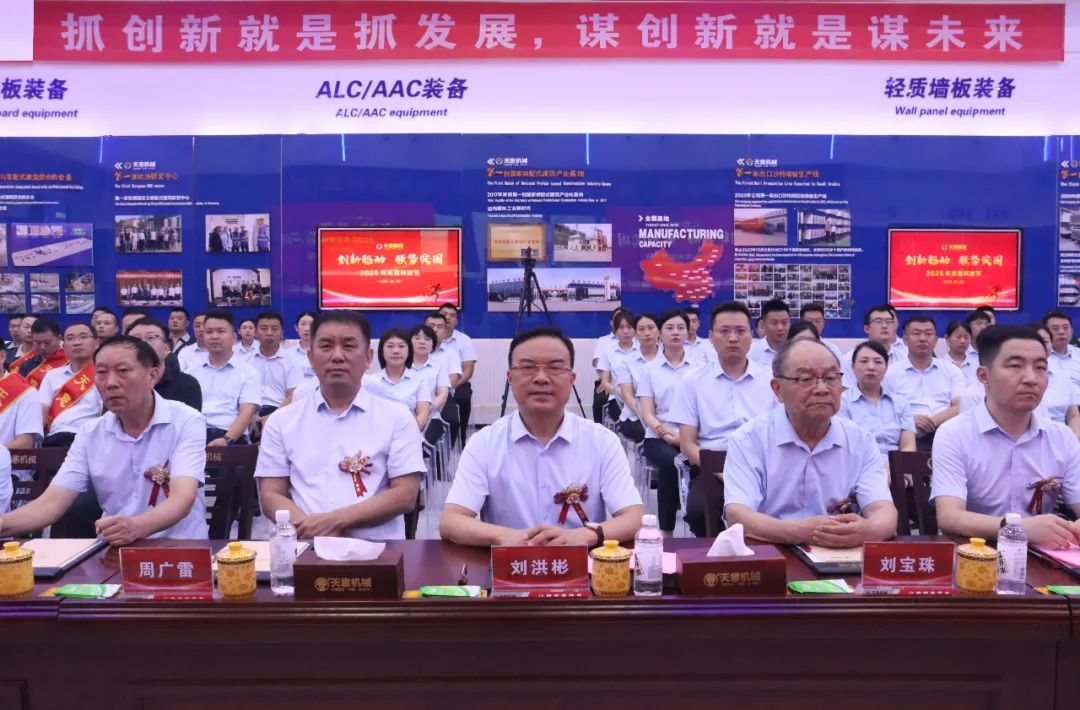 最后,集團(tuán)董事長劉洪彬做集團(tuán)總結(jié)及未來展望。劉總指出,天意上半年發(fā)展呈現(xiàn)三方面特點(diǎn),第一,創(chuàng)新驅(qū)動:以創(chuàng)新為市場回暖積蓄力量。上半年,研發(fā)了模塊智能化柔性生產(chǎn)線,為模塊化房屋建造提供智能裝備,研發(fā)了光伏清掃機(jī)器人,提供光伏電站清潔解決方案。天意榮獲山東省五一勞動獎狀,入選山東省先進(jìn)級智能工廠、省級專家服務(wù)基地,卓越也建成了新的工業(yè)互聯(lián)網(wǎng)展廳。上半年,產(chǎn)學(xué)研合作邁出新步伐,天意與山東大學(xué)共同舉辦了“天意杯”山東大學(xué)第五屆智造未來創(chuàng)新大賽,山東交通學(xué)院黨委書記王偉一行、山東建筑大學(xué)校黨委常委、副校長邱立平一行來集團(tuán)參觀座談,共謀發(fā)展新篇章。第二,國際市場:用中國智造點(diǎn)亮"一帶一路"。上半年,天意參加了俄羅斯國際工程機(jī)械展、廣交會、德國寶馬展、漢諾威工業(yè)博覽會、沙特阿拉伯利雅得五大行業(yè)展覽會等重量級國際展會。塔吉克斯坦總統(tǒng)親臨考察的墻板項(xiàng)目,成為當(dāng)?shù)鼐G色建筑的示范工程。與俄羅斯客戶簽訂了ALC和PC大單。這些突破不僅帶來了42%的出口增長,更讓中國建材高端裝備贏得了世界尊重。第三,強(qiáng)勢突圍:三大引擎驅(qū)動未來發(fā)展。在鞏固裝配式建筑裝備主業(yè)的同時,培育了三大新增長極,分別是光伏清掃機(jī)器人(已具備智能導(dǎo)航、自主清潔、高效節(jié)能等特點(diǎn))、智慧物流(目前已有京東、拼多多、好想來等大型企業(yè)入駐)、新能源業(yè)務(wù)板塊(天意已實(shí)現(xiàn)了80%的綠電生產(chǎn),正在搭建離網(wǎng)儲能系統(tǒng),未來還將建設(shè)微電網(wǎng)和虛擬電廠)。