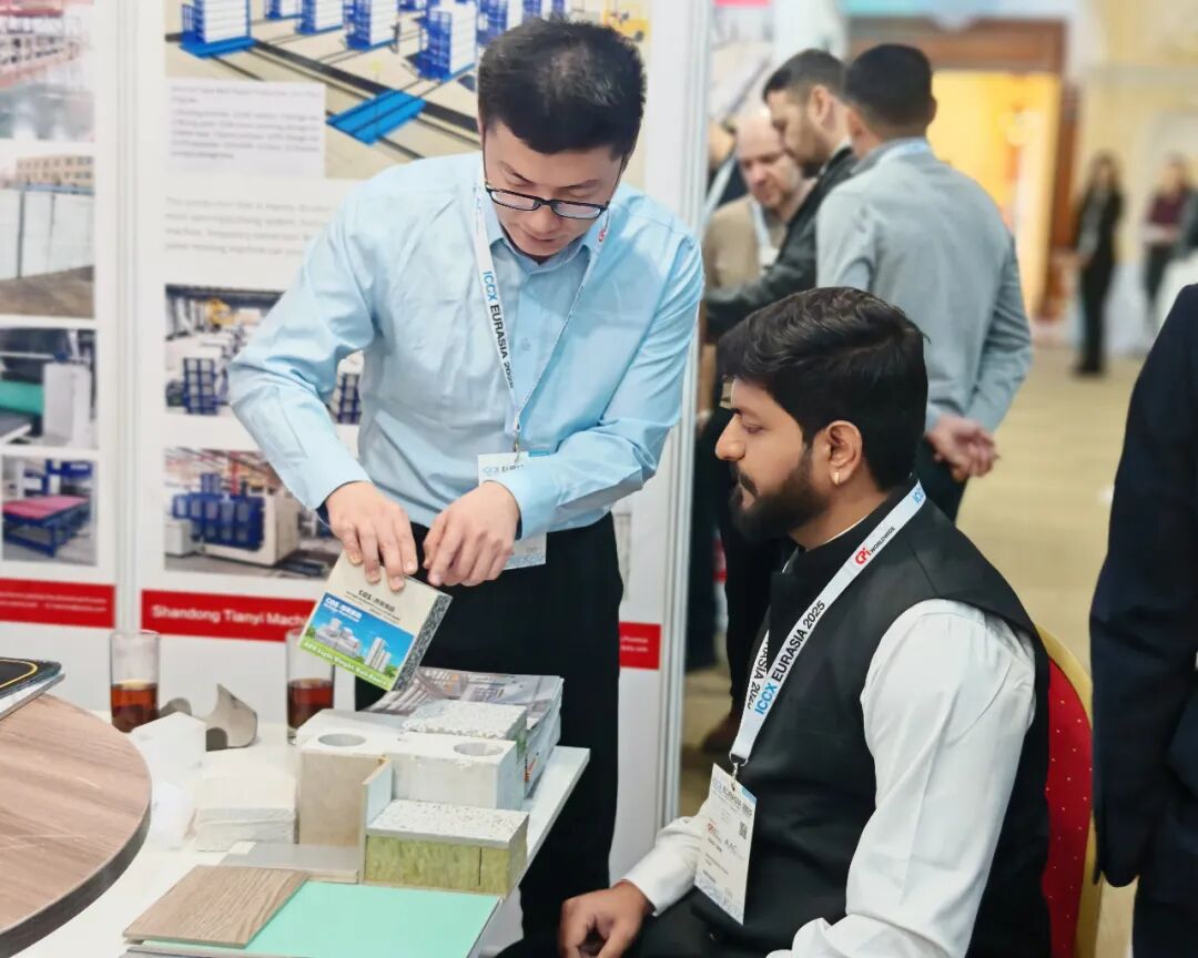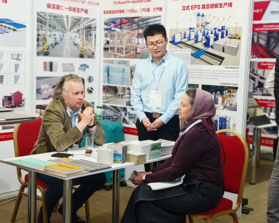 在裝配式建筑裝備方面,天意集團展示了PC生產(chǎn)線、墻板裝備和保溫裝飾一體板生產(chǎn)線。PC生產(chǎn)線自動化流程設(shè)計,減少人工依賴,契合當?shù)貏趧恿寄芩讲灰坏默F(xiàn)狀,有助于提升施工穩(wěn)定性;墻板裝備實現(xiàn)工業(yè)廢渣再利用,降低建材成本,符合環(huán)保政策要求;保溫裝飾一體板生產(chǎn)線可生產(chǎn)集多種功能于一體的新型墻體材料,采用模塊化設(shè)計,能根據(jù)客戶需求靈活配置不同飾面工藝,滿足中亞地區(qū)多樣化建筑風格需求。