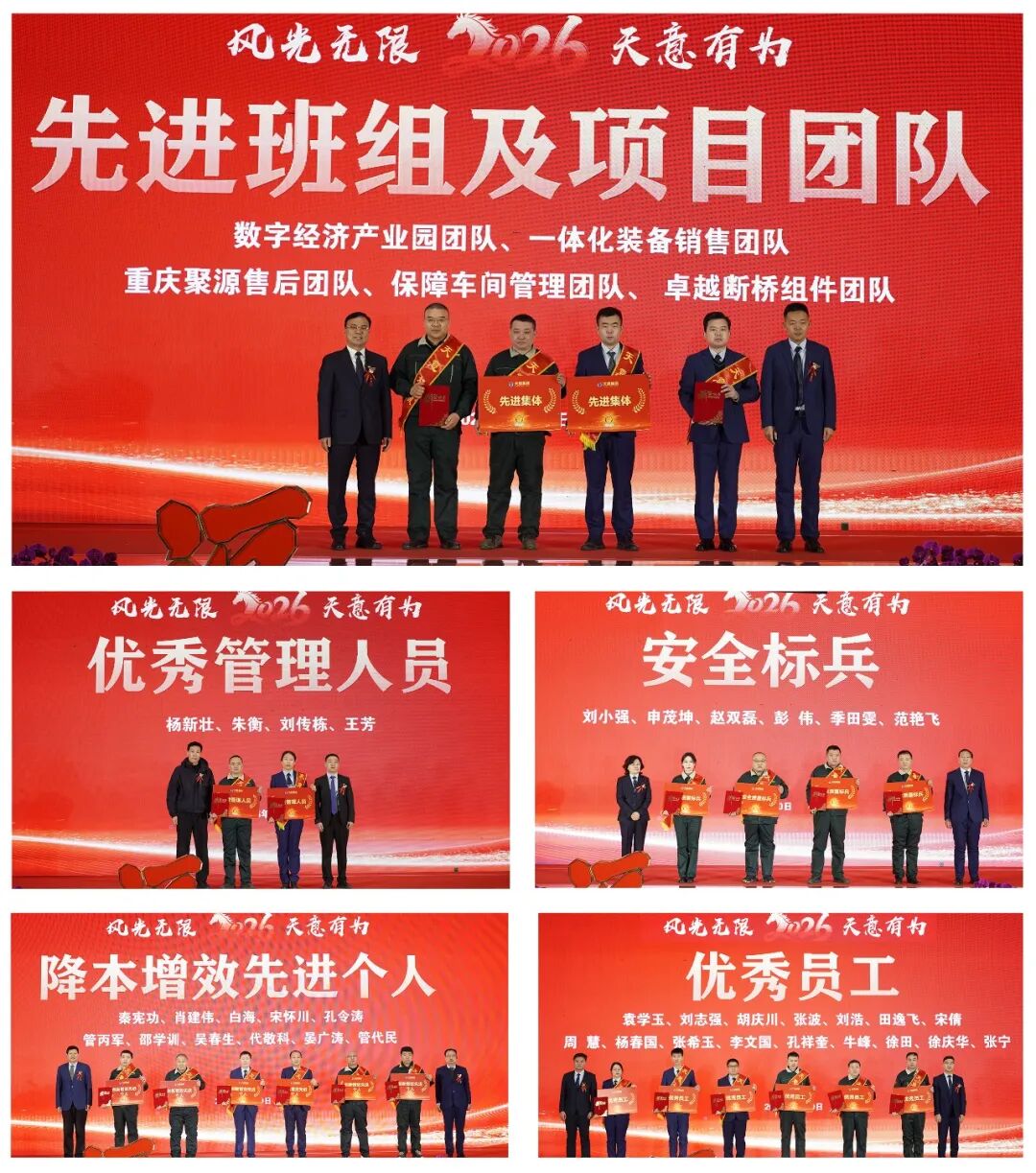 星光不負(fù)趕路人,時光不負(fù)實(shí)干者。2025年集團(tuán)涌現(xiàn)出大批愛崗敬業(yè)、實(shí)績突出的優(yōu)秀個人與集體,成為全體天意人學(xué)習(xí)的榜樣。常務(wù)副總蘇冬青宣讀表彰決定,優(yōu)秀員工、降本增效先進(jìn)個人、安全標(biāo)兵、優(yōu)秀管理人員、先進(jìn)班組等榮譽(yù)依次頒發(fā),獲獎代表登臺領(lǐng)獎,現(xiàn)場掌聲雷動。