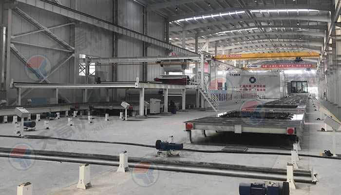 產(chǎn)品展示PC環(huán)形疊合板生產(chǎn)線采用高精度、高結(jié)構(gòu)強(qiáng)度的成型模具,經(jīng)自動布料機(jī)把混凝土澆筑其中、振動臺振搗后并不立即脫模,而是經(jīng)預(yù)養(yǎng)護(hù)、蒸汽養(yǎng)護(hù),使構(gòu)件強(qiáng)度滿足設(shè)計(jì)強(qiáng)度時才進(jìn)行拆模處理,拆模后的成品構(gòu)件運(yùn)輸至成品暫存區(qū)或室外堆場,而空模臺沿輸送線自動返回,形成自動化環(huán)形流水作業(yè)。