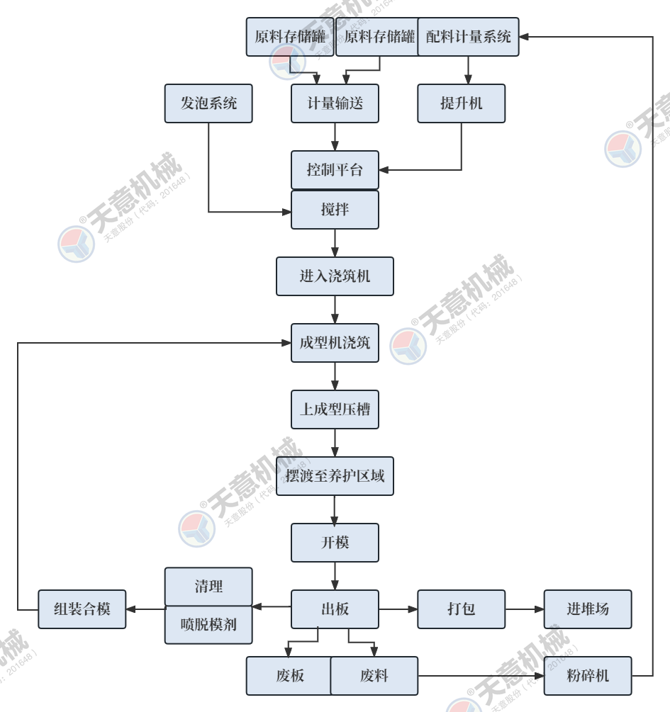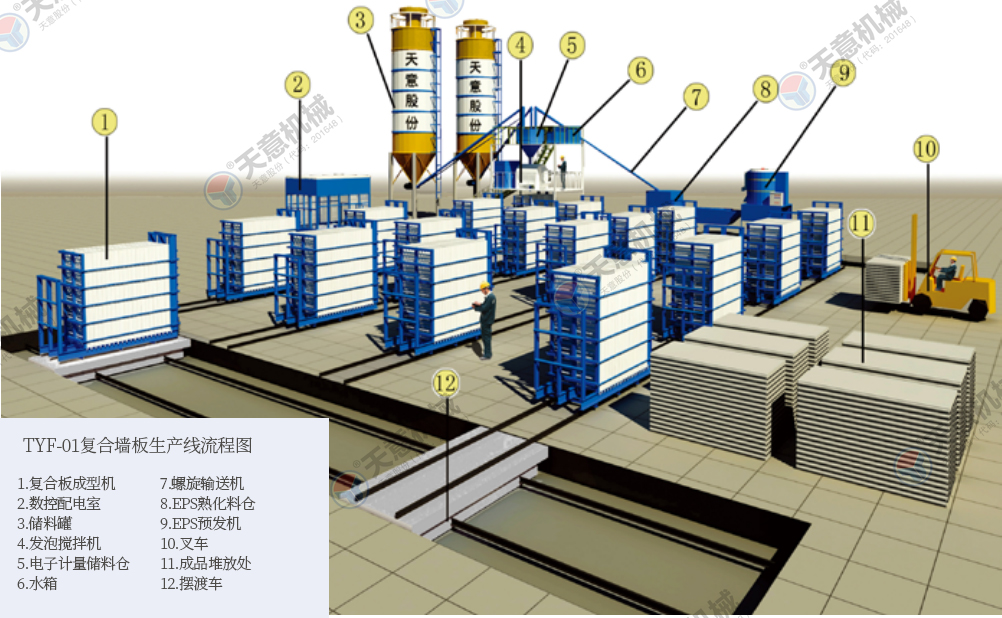 TYF-01型立式復(fù)合墻板生產(chǎn)線,設(shè)備占地面積小,產(chǎn)品一次成型,產(chǎn)量高。主機(jī)配有自動(dòng)行走系統(tǒng),設(shè)備運(yùn)轉(zhuǎn)更簡單快捷,大型固定式攪拌設(shè)備,攪拌料漿更均勻,澆注效率更高。 工藝流程
