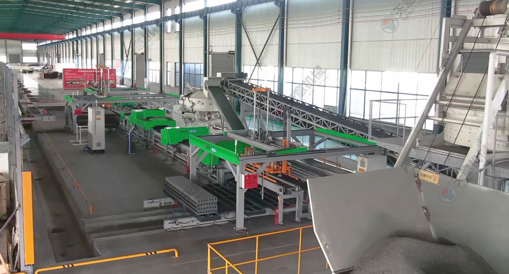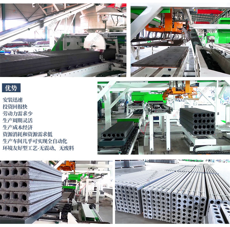 擠壓墻板生產線結構緊湊,自動化程度高,設備主機固定,墻板成型時物料受擠壓和振動同時作用,連續(xù)自動擠壓振搗成型,保證墻板具有良好的密實性和外形尺寸,成型后進行初凝養(yǎng)護。板坯移動方便,場地使用靈活、利用效率高。成型工段推料擠壓螺旋變頻調速,由中央控制器調整控制灰渣板成型的密實程度,實現(xiàn)灰渣板的連續(xù)自動流水線生產。由于采用低水灰比的干硬性混合料擠壓成型,可得到強度和密實度較高的空心墻板。自動化連續(xù)生產,效率高,質量一致性高,保障了墻板品質。廣泛用于框架結構和鋼結構建筑物。